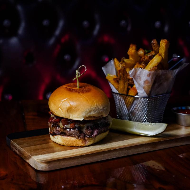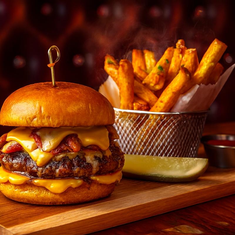 8oz prime ground beef, thick applewood bacon, lettuce, tomatoes, red onions, homemade French fries, pickles