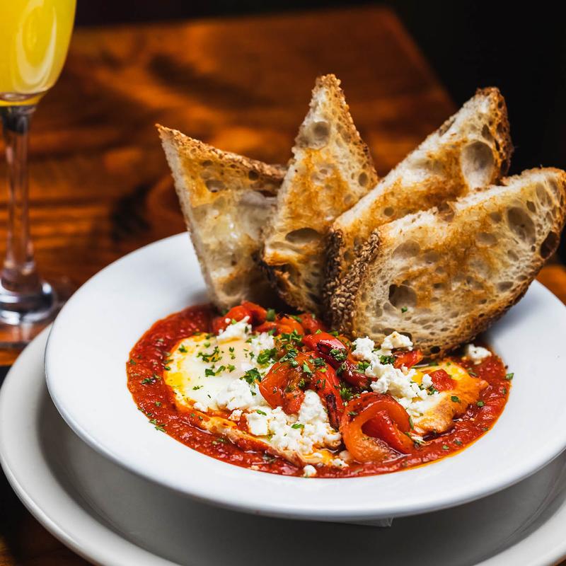 Home made cooked tomatoes with garlic, bell peppers harissa, poached eggs, feta cheese, toast, fresh herbs
